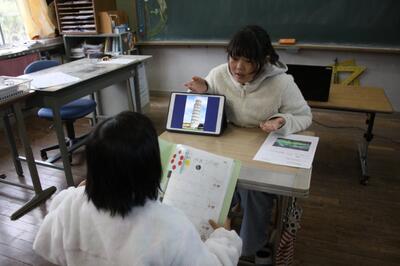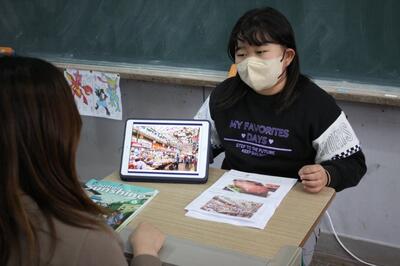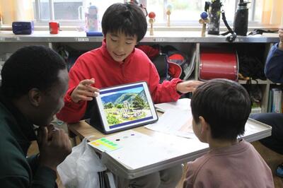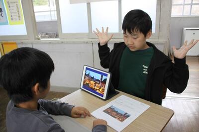 さて、いよいよ本番です。5・6年生がツアー・コンダクター役でタブレットPCを使いながらお薦めの国について英語で説明してくれます。1~4年生もただ聞くだけではなくて聞き取れた英語(単語)をリピートします。そして、6人の説明の中から、行ってみたい国を決めなければなりません。来店の瞬間から始まり、大盛り上がりでした。英語で会話するのって、こんなに楽しいものなのだなと感じました。