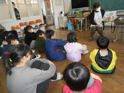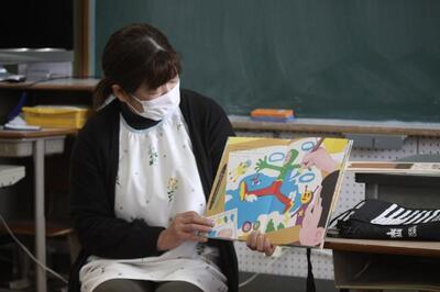 2/25(水)は、読み聞かせの日でした。今回は、西田恵美さんが『うえきばちです』、『100ねんごも またあした』、『ねこ いる! いる!』の3冊を読んでくださいました。植木鉢にのっぺらぼうを植えたら、め(目)が出て、は(歯)が出て、はな(鼻)が咲いて・・・意外な展開で終わる絵本に「え!?」と声が出る子どもたち。『ねこ いる! いる!』でも意外なところに猫が隠れていて・・・よく見ると、恵美さんの絵本をめくる指先にも猫型の指サックが・・・。おもしろい絵本をありがとうございました。