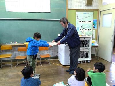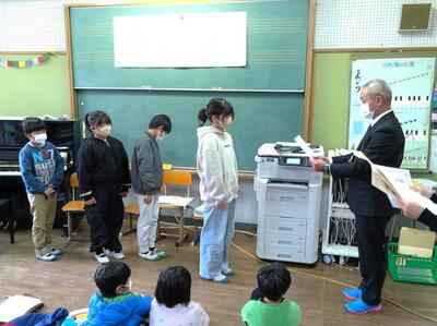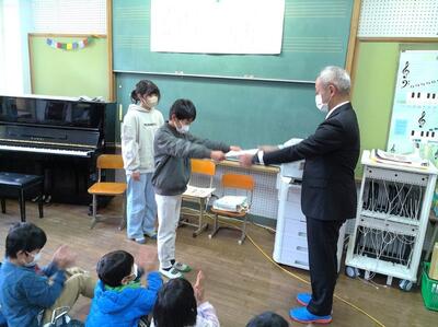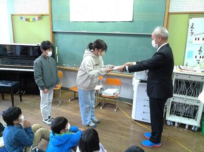 12/24(水)は、2学期の終業日でした。荒谷小の10名の児童が、この2学期中元気に学校生活を送り、日々の授業や様々な学校行事等で頑張ってくれたことをとても嬉しく思います。終業式では、5年生の黒田咲帆さんが代表して「2学期を振り返って」という題で、特に頑張ったことや嬉しかったことを発表してくれました。校長の話(しあわせと為せば成る)の後の校歌斉唱では、晴れ晴れとした歌声で歌ってくれました。終業式後には、学習面・生活面・保健面からそれぞれ担当の先生から話がありました。しっかりと聴くことができていました。また、図書委員会からは冬休みに読んで欲しい本を一人一人に2冊ずつ選んでメッセージを添えてプレゼントするというサプライズもありました。さらには、「明るい選挙ポスター(金賞)」や「西日本読書感想画(2席3名、3席1名、佳作1名、入選2名)」、「体力賞(総合評価A)」、「剣道昇級証書」などたくさんの賞状の授与を行いました。日々子供たちを励まし、応援してくださている保護者の皆様や地域の方々に心より感謝を申し上げます。ありがとうございます。