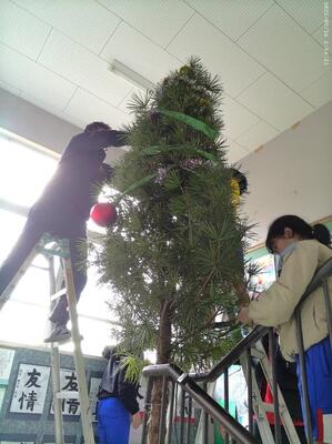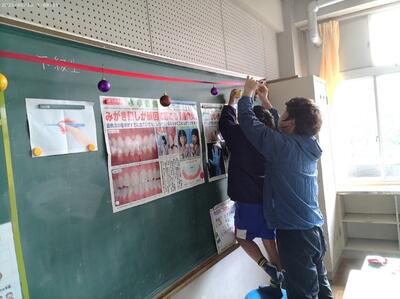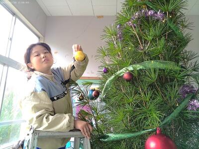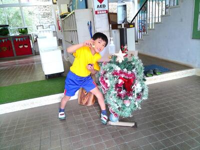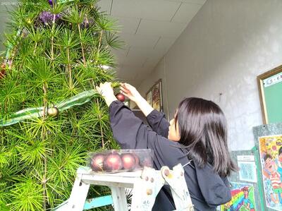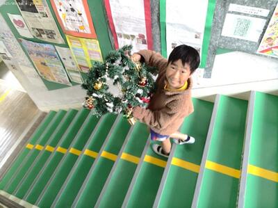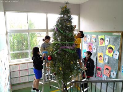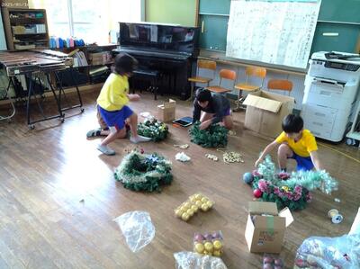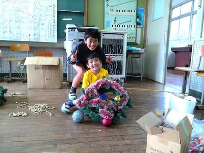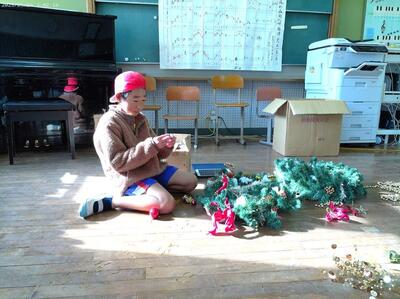 12/2(火)のクラブの時間に、全校児童10名でクリスマスツリーとリースなどを飾りました。荒谷小にお越しの際は、玄関や階段、ランチルーム、体育館に飾ってありますので、どうぞご覧ください。ちなみにツリーの木は、3m程の立派なコウヤマキの木で、毎日給食を届けてくださっている運転手さん、甲斐盛恵様からご提供いただきました。ありがとうございました。