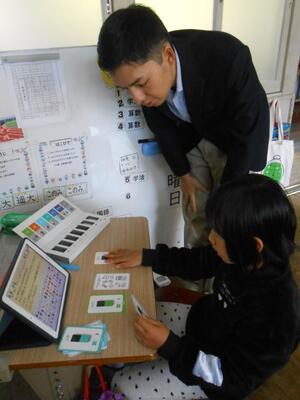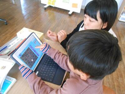 荒谷小では、毎月1回マイク先生に来ていただき「プログラミング学習」をしています。1年生もどんな指示を出せば、思う方向へ進むか考えました。3・4年生も指示する内容をタブレットパソコンに整理していました。どの学年も楽しそうに学習していました。