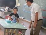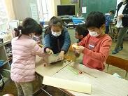 早速1年生は2~3人のグループに分かれて、作ってみたいおもちゃのブースに行きました。糸電話を作った子どもは、担任の先生と一緒に遊んでいて、先生から小さな声で名前を呼ばれると「聞こえたー!!」と言って、とっても嬉しそうな表情をしていました。