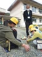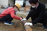 こまを打った33本の原木が出来上がりました。次に、これらを校舎の裏に運びます。そして、地面に置いてしばらくふせこみをします。「なぜ原木を地面に置いておくのでしょう?」としいたけ博士から質問がありました。すると3年生が「地面に置いておくと水がまきやすいから。」と答えました。それを聞いたしいたけ博士は「ほぼ正解!さすが1~2年生の時に学習しただけあるね!」と誉めてくださいました。実は今回使った原木は11月に切ったものだそうです。そのため、原木から水分が抜け軽くなっています。そこに、湿ったこまを打ってそのままにしておくと、こまの水分が抜けてしまい菌が原木に回らなくなるそうです。そのため、ふせこみをして、地面の水分を吸収させ、原木が乾燥しないようにするようです。