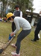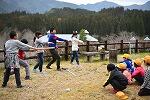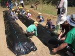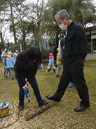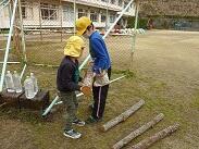 全校児童でのこま打ちが終わった後は、1・2年生がふせこみの続きをしました。まずは、原木にたっぷりと水をかけます。その後、ブルーシートで原木を覆い水分が飛んでいかないようにします。
