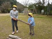 「これ○○ちゃんの木よ。」と運んできてくれる子どもがいたり、保育所生が打ったこまに仕上げをしてくれる子どもがいたりして、みんなで協力しながらこま打ちを行っていました。そして、6年生は原木にドリルで穴を開ける体験もしました。原木に直角にドリルを当て、等間隔に穴を開けていきます。6年生は思い切りがよく、みるみる穴を開けていきました。