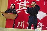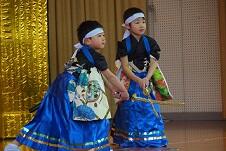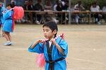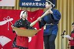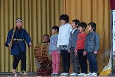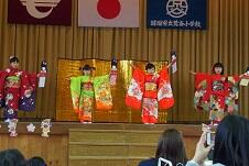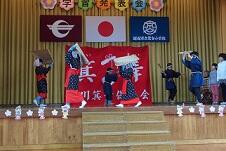 劇の次は「箕舞」です。この日のために、2回も来校され、ご指導くださった地域の方たちに感謝の気持ちを表すため、そして伝統文化を受け継いでいく気持ちを伝えるという思いが子どもたちにはあります。舞い手はお互いに動きを確認しながら舞い、囃子も大きな声で舞い手を支えて「箕舞」を作り上げました。