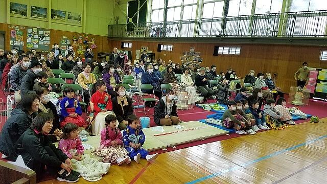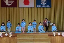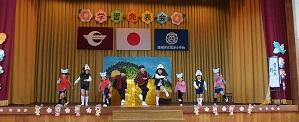 前半が終わり、次は保育所生の「おむすびころりんすっとんとん」です。場面が変わる時には、自分たちで背景を変えたり、並ぶ時は隣の人との間を考えて立ったりするなど、子どもたちが考えて動いている姿が印象的でした。