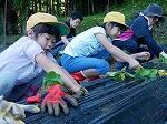 今年も地域の方の畑をお借りし、芋の苗植えをしました。粘り気の強い土に悪戦苦闘しながらも苗が抜けないように土をかぶせることができました。畑を貸してくださり、この日のために畑を耕したりマルチを貼ったり等の準備をしてくださった地域の方への感謝の気持ちを忘れず、苗がどのように成長しておいしいサツマイモができるのか、わくわく学習等で観察しながら見守っていきたいと思います。