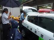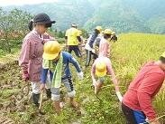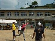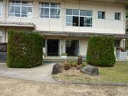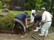 運動場が一段落つくと、次は外回りの草刈りです。通りかかった車の中から手を振ってくださる方がいたり、「今から六峰館に行ってくるわ」と話しかけてくださる方がいたりして、この地域の温かさや親しみやすさを感じました。また、外回りを作業中、「ハチがおるよ、気をつけて!」と周りの方に呼びかけておられる方がいました。すると、すぐに殺虫剤を持った地域の方が近くに来て、殺虫剤を噴霧してくださいました。また、車で通りかかった地域の方がハチのことを聞き、更に殺虫剤を噴霧してくださいました。