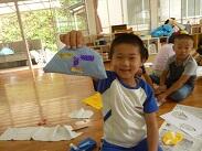 子どもたちの凧もできあがり、今日の1時間目に1・2年生が運動場で凧あげをしました。1年生が凧に描いた絵は恐竜やクジラで、2年生は花やネコを描いていました。それぞれ個性あふれる仕上がりになっていました。