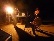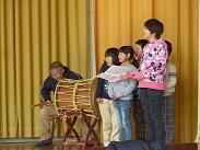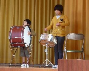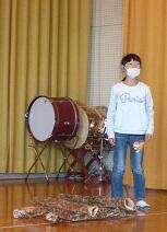 【1年生は大太鼓も叩きます。6年生は小太鼓とトライアングルを掛け持ち】