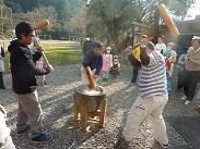 今日は、特に杵を持つ男子の動きに焦点をあてて練習をしました。舞う際にまっすぐ円を描くように舞うのではなく、外を向いたり内を向いたりしてジグザグに舞うことがポイントだそうです。「まっすぐ舞ってしまうと、箕の子どもたち(女子