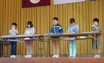 その後、4年生の代表児童が作文、「上級生らしくなった1学期」を発表しました。上学年の仲間入りをした4年生、上級生としてがんばった4つのことを作文に表現していました。1つ目は「漢字を覚えること」、2つ目は「あきらめない力」、3つ目は「50m走」、4つ目は「リーダーシップ」です。上級生としての自覚が、4年生児童を一回りも二回りも成長させたことが分かりました。