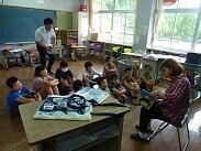次に「からすのパンやさん」という絵本を読んでくださいました。からすが営むパンやさんに4つ子の赤ちゃんが生まれて「ちょこちゃん」、「りんごちゃん」、「おもちちゃん」、「れもんちゃん」と名付けられました。仕事と子育てが忙しいからすのお父さんやお母さんが焼いたパンがひょんなことから人気になり、パンやさんはみるみる繁盛していきます。たくさんのパンが出てくるこの絵本、こんがり香ばしい香りが漂ってくるような読み聞かせの時間でした。