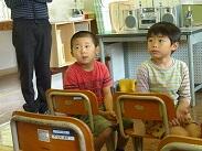 最後は「こまこまアニメーション」の発表でした。これは図工の学習の発表です。自分で作成したキャラクターとストーリーを写真で撮り、それをアニメーションのようにつなげていきました。恐竜が出てくる「こまこまアニメーション」では、りんごの木になっているりんごを取りに来た恐竜が、ようやくりんごを取りました。しかし後から来た人間にそのりんごを取られてしまいます。すると、恐竜が火を噴きました。驚いたことに人間も応戦し火を噴きました。あっと驚く展開に「火、噴いたー」とか「強ーい」、「今度はガードした!」、「これ、アニメやね!」等と見ている子どもたちは大はしゃぎでした。それから「まいごのりんちゃん」、「ねこの夢」という題名の「こまこまアニメーション」を発表しました。今回の「こまこまアニメーション」の特色は、一つ一つのアニメーションが単体ではなく、つながりがあるということです。例えば、一番始めのアニメーションに出てきた恐竜が次の「まいごのりんちゃん」でもひょっこり表れるという、面白いシナリオでした。