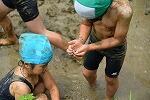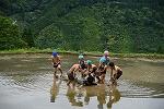 はじめは、おそるおそる入っていましたが、「汚れても洗えばいい!」を合い言葉に、先生の指示で泥の中で体育座りをしたり、寝転んだりして、次第に慣れて行き、いつの間にかみんなどろまみれになっていました。田んぼの中のおたまじゃくしを捕まえたり、泥でチョコレート屋さんをしたり、「先生」対「1・2年生」で相撲をしたり、楽しい笑い声で溢れていました。