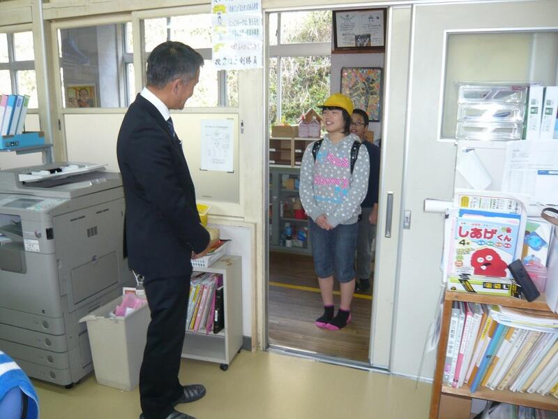 その後、校長先生から自然災害についてのお話がありました。まず、避難訓練は「いのちの学習」であることをお話されました。そして、スライドを用いて雨が降るまでの天気の移り変わりを見せてくださったり、平成17年の台風14号がもたらした諸塚村の被害を写真で見せてくださったりしました。普段は穏やかな流れの川が濁流になり、見覚えのある場所や商店街を飲み込んでしまっている写真を見ると、とても悲しい気持ちになりました。