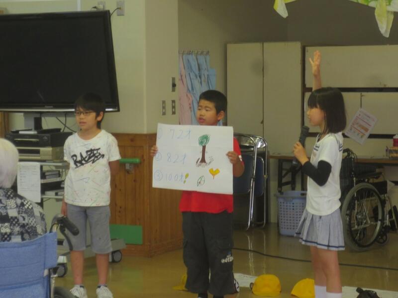 ホールに入ると、早速入所されている方々へ荒谷小の紹介をしました。校歌を歌ったり、荒谷小のクイズを出したり、荒谷小の1日を発表したりしました。その後「だれにだっておたんじょうび」を歌い、子どもたちの元気な歌声や笑顔を届けました。