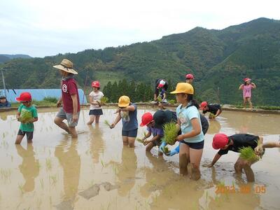 6月5日(月)に、学校の上にある田んぼを地域の方からお借りして、田植えをしました。