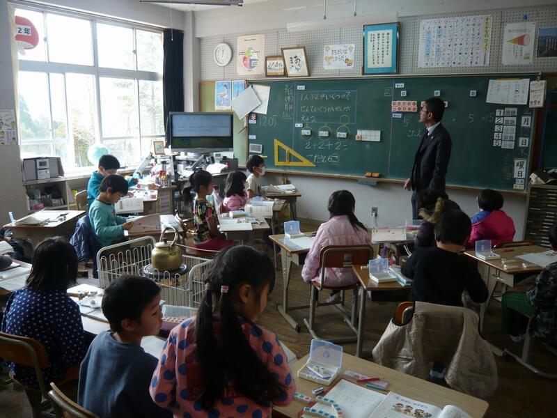 いつもは1・2年生教室として使用している教室に1年生が入り、5・6年生教室として使用している教室に2年生が入って勉強をしました。いつもは1・2年生教室は4つの机しかないのに、今日は教室いっぱいに机が並びました。荒谷小の4名の1・2年生だけでも明るくにぎやかですが、今日はまた違った賑やかさで、みんな楽しそうに学習していました。