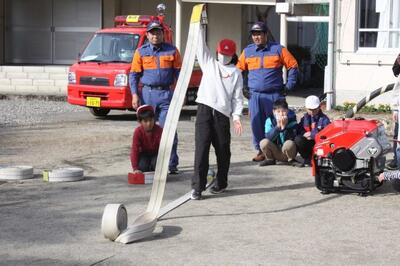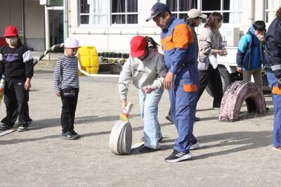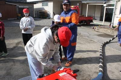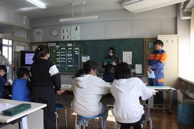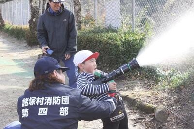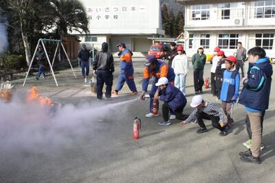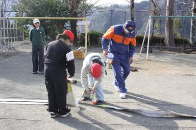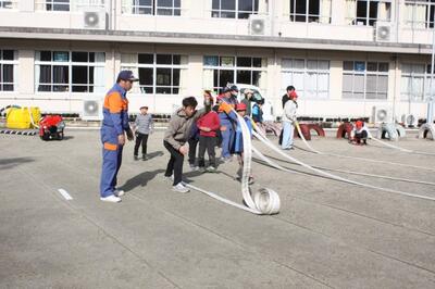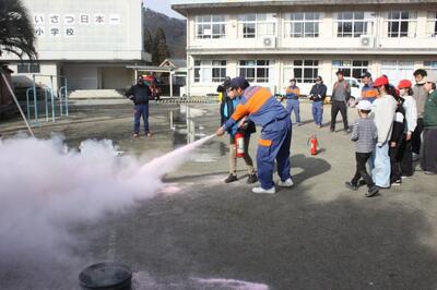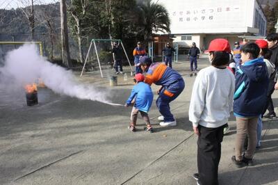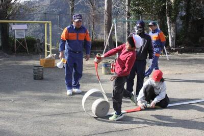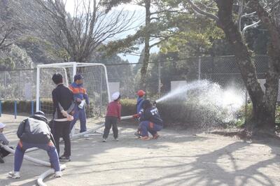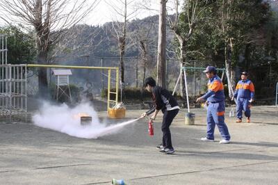 1/20(火)の午後、避難訓練(火災)を行いました。諸塚村役場総務課の消防主任の堀田さんと諸塚村消防団第4部団長の中田さんはじめ第4部消防団の計7名を講師に、安全な避難の仕方や放水の仕方(ホースの広げ方と接続、ポンプや放水口の扱い方)、消火器を使った消火の仕方について学びました。また、消火活動や消防団に関する児童の質問についても丁寧に教えていただきました。「自分たちの地域は自分たちで守る」という崇高な使命感で日々活動されていらっしゃる隊員さんの格好いいお姿と優しさを実感する避難訓練でした。ありがとうございました。