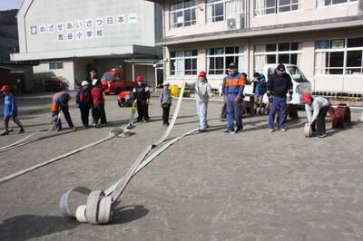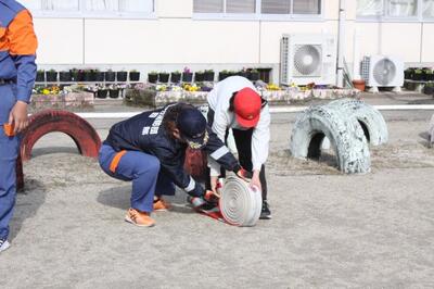 【ホースの広げ方を学び、2チームに分かれて放水訓練を行いました】