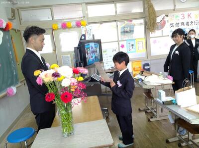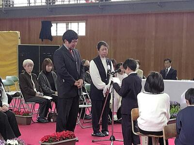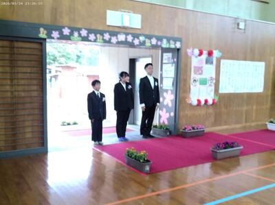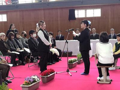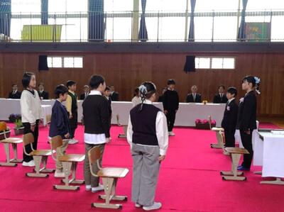 3月25日(水)、6年生の2人が荒谷小学校を卒業しました。卒業証書を受け取った後に将来の夢を発表する場面、在校生との別れの言葉、合唱、アーチをくぐる退場、最後の学級の時間等・・・それぞれに記憶に残るシーンがいっぱいある素晴らしい卒業式でした。特に感動的だったのは、卒業生が手紙に書い家族へ感謝の気持ちを伝える場面でした。地域の方々に見守られ、家族の愛情をいっぱい受けて育まれてきた純粋な気持ちを表現してくれた卒業生、諸塚中学校に進学してからも時には荒谷小に遊びに来てくださいね。