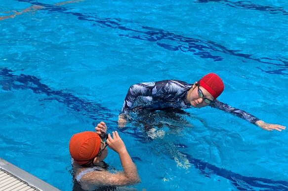河内さんの特技である水泳を生かして、本校の水泳学習のサポートをしていただいています。他にもいっしょに給食を食べたり、昼休みに遊んだりして、子供達とのふれあいを深めています。