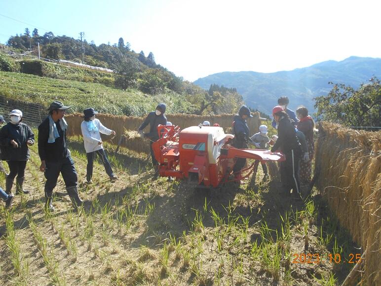 10月25日(水)は脱穀体験をしました。天日でしっかり乾燥させてからの脱穀でした。今年は晴れの日が多かったため、豊作とのことでした。