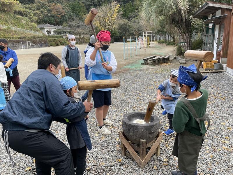 午後は餅つき大会、前日から当日まで、多くの方に協力をいただき、実施することできました。ここでの餅米は、地域の方から提供していただいたお米を使用しました。子どもたちは力を込めて杵をつきました。