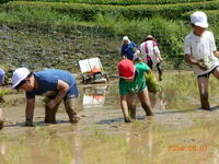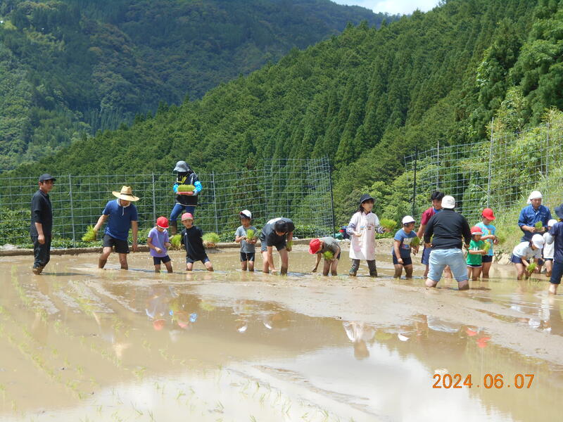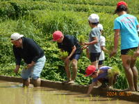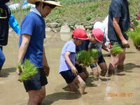地域の方のご厚意で田んぼをお借りして6月7日(金)に全校生徒で田植え体験学習を行いました。思いのほか田が深く、児童は悪戦苦闘しながら、自分のペースで苗を植えておりました。それぞれ見事なカーブを描いたり、ジグザクになったり、大人が修正を加えながら、田植え体験学習を終えました。講師の先生も「今年はいいぞ!合格」と苦笑いしながら言っていただきました。普段体験することができない貴重な体験となり、今後の食事で米粒1つ1つを大切にすることにつながっていくような気がします。準備してくださった地域の方々、手伝ってくださった保護者の方々ありがとうございました。
