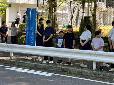 6月14日(金)に諸塚中の中学生と荒谷小の小学生が朝の10分程度、合同であいさつ運動を行いました。荒谷小の児童は、学習も兼ねて、自分たちでバスに乗り諸塚中まで行きました。少しの時間でしたが、道行く車に大きな声であいさつができました。あいさつの大切さを改めて感じてくれる体験になったことと思います。