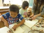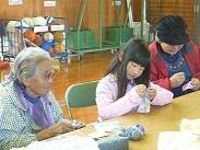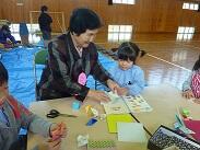 おじゃみ作りでは、「この布の模様に沿って縫えばいいが」と言って縫い方を教えてもらっていました。そして、「この布は孫が小さい頃に着ていたワンピースを切ったものやとよ~」と懐かしそうに話されていました。すると「古くなったセーターとかも腕の部分だけ使って腕ぬき(アームカバー)にできるがね。山仕事をすることが多いから便利屋とよ~」と近くに座っていた方も話されるなど、賑やかなテーブルで楽しく作業をしている姿が印象的でした。竹とんぼづくりでは「あ!間違った、どうしよう」と不安げな子どもに、「いいが、反対側も同じようにけずればいっちゃが」とアドバイスをしてくださる方もいました。