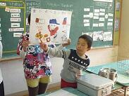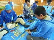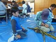 今日の2~3校時は、寿会の皆様と昔の遊びを教えていただきました。子どもたちは、この活動を通して寿会の方々とコミュニケーションを図って色々な話をしたいと考えています。今回も、竹でっぽう、竹とんぼ、おじゃみ、折り紙に分かれての作業です。