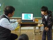 最後は「こまこまアニメーション」の発表でした。これは図工の学習の発表です。自分で作成したキャラクターとストーリーを写真で撮り、それをアニメーションのようにつなげていきました。恐竜が出てくる「こまこまアニメーション」では、りんごの木になっているりんごを取りに来た恐竜が、ようやくりんごを取りました。しかし後から来た人間にそのりんごを取られてしまいます。すると、恐竜が火を噴きました。驚いたことに人間も応戦し火を噴きました。あっと驚く展開に「火、噴いたー」とか「強ーい」、「今度はガードした!」、「これ、アニメやね!」等と見ている子どもたちは大はしゃぎでした。それから「まいごのりんちゃん」、「ねこの夢」という題名の「こまこまアニメーション」を発表しました。今回の「こまこまアニメーション」の特色は、一つ一つのアニメーションが単体ではなく、つながりがあるということです。例えば、一番始めのアニメーションに出てきた恐竜が次の「まいごのりんちゃん」でもひょっこり表れるという、面白いシナリオでした。