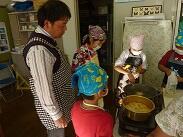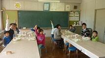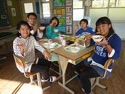 教室をのぞいてみると、1・2年生は「サツマイモがあまいです」と言ってパクパク食べていました。3・4年生は「しいたけが肉厚です!」と笑顔を見せ、5・6年生にはサツマイモがどっさり入った石狩汁が準備されていました。