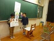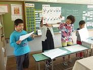次に、国語の学習の発表をしました。写真や想像から物語を作ったものを発表しました。日常を舞台にしたものや魚を主人公にしたもの、戦争をテーマにしたもの、人を助ける猫をテーマにしたものがありました。物語がどんな展開になるのかなぁと聞いていると、聞きたい部分で物語りが止まり「それからどうなったでしょう?」と問いかけていました。物語の続きを聞きたい!と思う気持ちと、自分の中で想像する楽しみがある発表でした。