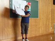次に3・4年生の発表です。3・4年生もこれまでの学習の途中経過を発表しました。3年生は、林業をする人の作業の負担を軽くするための機械を考えています。その機械を設計するまでの過程や、設計してからの改良など見所いっぱいです。4年生は、「林業と人」というテーマから、インタビューの内容をまとめていました。そのインタビューの中でその児童の琴線にふれるキーワードがあったのではないかなぁと思うものがありました。これからどのように学びが進んでいくのか楽しみな発表でした。発表を聞いた1・2年生と5・6年生からは「地域の方にインタビューをしたのがすごいと思った」、「インタビューをした意見はどのように扱うのか?」等の感想や質問が出されました。