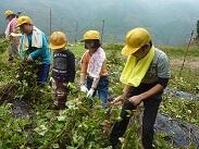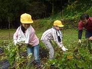その後、いものツルや葉っぱを取りました。「綱引きみたーい」、「いも引きやね」、「ツルにカマキリのたまごがありましたー」など楽しそうな声があちらこちらから聞こえてきました。それからマルチを取り除きました。
