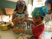 スイートポテト班は、ゆでたサツマイモをつぶして生クリームや砂糖、卵黄などを加えて混ぜていきました。混ぜ終わったら、表面に卵黄を塗ってつや出しをしました。それからトースターで焼きます。一口サイズのかわいらしいスイートポテトが出来上がりそうです。