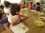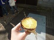 そして、給食の後「おいもが焼けました!」と嬉しい知らせが来ました。早速みんなで外に出て、焼きたてのほくほくした焼きいもを食べました。塩水につけた効果もあったのか、とっても甘くてしっとりしたおいしい焼きいもでした。「おいもを食べたらおにぎりが欲しくなったー」、「焼きいもがデザートやね」などと言う子どももいて、まだまだお腹に余裕があるようでした。今日は給食に加え、焼きいもも食べられ大満足の子どもたちでした。