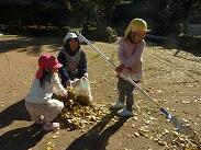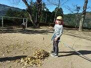 今日の3校時には、落ち葉がヒラヒラと舞う運動場から保育所生の声が聞こえてきました。様子を見てみると、子どもたちが運動場の落ち葉はきをしていました。子どもたちの遊びの選択肢には、缶けりやおにごっこに加えて落ち葉はきもあるそうです。黄色く色づいたいちょうの葉っぱを熊手や竹ぼうきで集めてくれました。「もうすぐもちつき大会だからきれいにしないとね」、「落ち葉があると小学生が転ぶかもしれないもんね」等と話しながら、楽しそうに作業をしていました。きれいな運動場で、長距離走大会・もちつき大会が迎えられそうです。ありがとうございました。