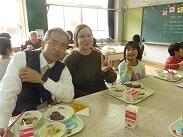 ごはんに黒米を混ぜると紫色になります。また、香ばしい香りもあり、とてもおいしいごはんです。すき焼きの中には野菜がいっぱい入っていて、大きな牛肉も入っていました。だいこんサラダは、「だいこんが漬け物みたいでおいしかった」と話す子どももいました。どれもとってもおいしくて、子どもたちはいつもよりも早く食べ終わって、生産者や実行委員の方との会話を楽しんでいました。「学校の給食は何十年ぶりに食べたかなぁ。おいしかった~」とお話ししてくださる生産者の方、給食を食べ終わった後はじゃんけんをして遊んでくださる実行委員の方など、積極的に子どもたちとふれあってくださいました。