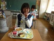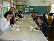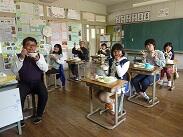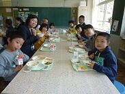 また、給食も一緒に食べてくださいました。今日は6年生のリクエストメニューです。「登校する時はどれくらいの時間をかけて歩いてくるの?」、「どんな給食をリクエストしてみたい?」、「先生の弟も林業をしてるよ。ヘルメットをかぶってチェンソーを持って。夏には下草刈りもしてるよ」と子どもたちに話しかけてくださっていました。子どもたちも「僕のお父さんは森林組合の所長をしていたので、僕も将来森林組合の所長になるんです」、「春休みはしいたけのこま打ちをずっとします。1年間で2万本くらいするんです」、「給食のしいたけ南蛮が好きです」など、物怖じすることなく話をしていました。