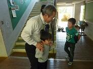 諸塚小に着くと、外に校長先生がいらっしゃいました。「荒谷小はどうね?」と話しかけてくださる校長先生に「体育があるから楽しい」と答えていました。全校児童で行う体育が1年生にとっては楽しみなようです。