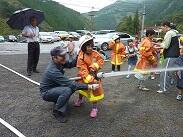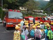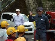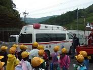はじめに到着したところは、諸塚村役場です。ここでは消防担当の方からお話を聞き、その後消防車や救急車を見学しました。お話の中で、「諸塚村内で救急車が出動するのは年間何回くらいでしょう?①10回②50回③100回」というクイズが出題されました。多くの子どもが②50回と③100回に手を挙げていましたが、正解は③100回だそうです。およそ3日に1回は救急車が出動していることになります。頻繁に出動しているんだなぁと驚きました。