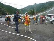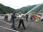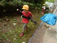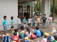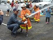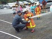 消防車や救急車を見学した後は、放水体験をさせていただきました。子どもたちは、消防服を着てヘルメットをかぶって小さな消防士さんになりました。「放水はじめ!」というかけ声とともに、レバーをひき放水します。目標となるところをしっかり見て放水をしたら「放水やめ!」と言ってレバーを元に戻しました。子どもたちは水の勢いに驚いたようでした。消防の見学を終えて、「消防士になりたくなった人?」と尋ねると、多くの子どもたちが手を挙げていました。人の命や自然を守る消防士のお仕事に憧れをもったようです。