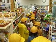 その後、2班に分かれて店舗見学兼買い物をしました。買い物では、商店街のコンビニエンスストアの方からお話があり、その後質問をしました。「一番売れる商品は何ですか?」との質問には「おにぎりやお弁当は毎日よく売れます。しかし、季節によって商品が変わるので、どれが一番かは分かりませんが、どの品物もよく売れます」と答えてくださいました。その後、300円以内でおやつを買いました。1年生と2年生がペアになっての買い物です。消費税もあり、難しい計算だったかもしれません。300円を超えてしまい、選び直すためにお菓子コーナーに戻る子どももいましたが、時間内に全員買い物ができました。