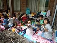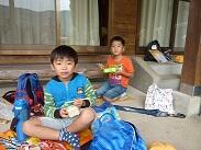 あっという間にお弁当を平らげて、おやつの時間になりました。なが~いグミを食べる子ども、おみくじのガムを食べる子ども、おやつを交換して食べる子ども等、それぞれにおやつの時間を満喫しました。その後、伝承館の遊具や広場で遊んで諸塚小に帰りました。