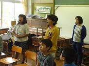 「囃子がいいね~、馬もたまがるわ」、「『おどま~』のところは話すように唄ってみて」、「途中で息を吸わないように気をつけて」等、子どもたちの唄をほめつつ、分かりやすいアドバイスをくださいました。特に①唄の最初の一文字をはっきり唄う②唄じりで息を吸う③強弱をつけるという点に気をつけると唄が上達するそうです。初めて駄賃付け唄の練習をする1年生は、上級生が唄う姿を見て一緒に口を動かして、一生懸命覚えようとしていました。